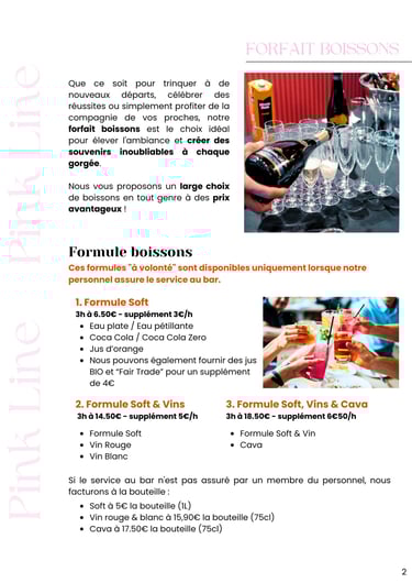 Que ce soit pour trinquer à de nouveaux départs, célébrer des réussites ou simplement profiter de la compagnie de vos proches, notre forfait boissons est le choix idéal pour élever l'ambiance et créer des souvenirs inoubliables à chaque gorgée.