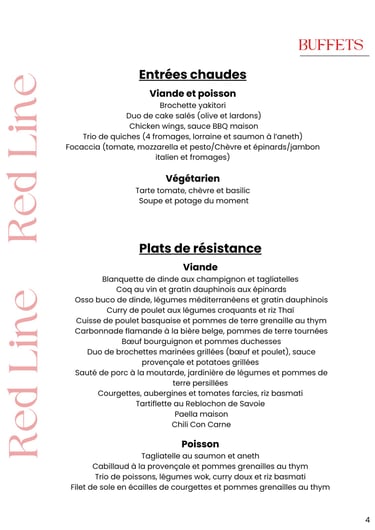 6 entrées (froides et chaudes), 4 plats chauds, 3 desserts