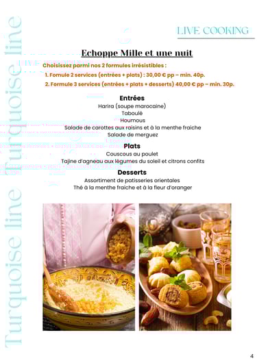 4 entrées (froides et chaudes), 2 plats chauds, 1 dessert