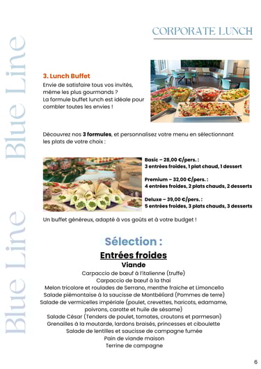 Avec notre Buffet, nous vous invitons à un festin sensoriel où les saveurs du monde se rencontrent. Des plats froids aux mets chauds, préparés avec soin par nos chefs talentueux, vous promettent un voyage gustatif inoubliable.